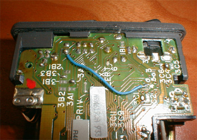 | Shown to the right is the location for the Vibe. It has 2 blue wires that go into the empty holes near the edge of the board. The vibe then snaps into place by pushing the plastic tabs through the two holes. It does not matter which blue wire goes into which hole. |