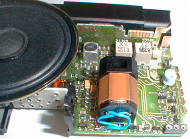 The picture above shows the vibe installed on a Minitor II pager. As you can see it attaches with two blue wires. The vibe is held in place by a black plastic holder which is surrounded by a noise reducing orange rubber.